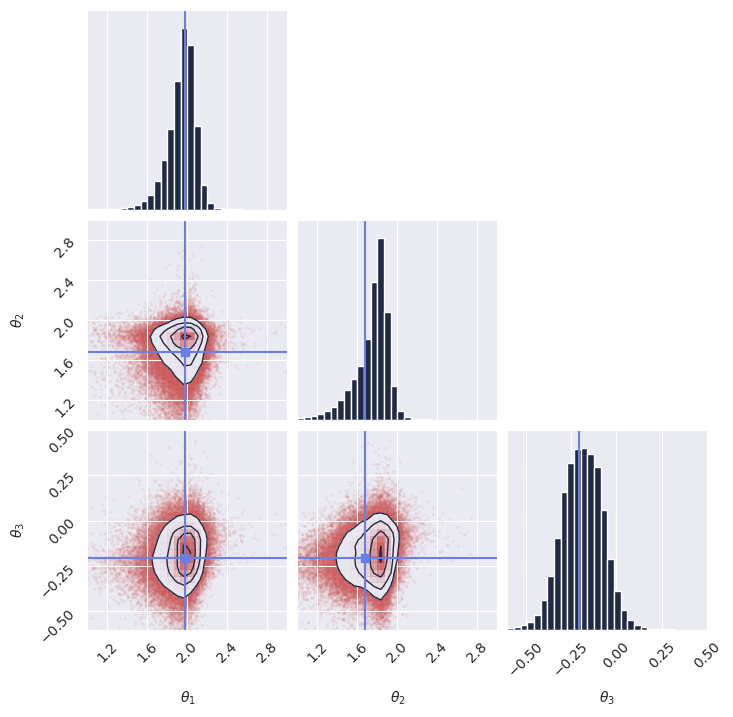 1# %% Imports 2import os 3 4# Set JAX backend (use 'cuda' for GPU, 'cpu' otherwise) 5# os.environ["JAX_PLATFORMS"] = "cuda" 6 7import grain 8import numpy as np 9import jax 10from jax import numpy as jnp 11from numpyro import distributions as dist 12from flax import nnx 13 14from gensbi.recipes import ConditionalDiffusionPipeline 15from gensbi.models import Flux1, Flux1Params 16 17from gensbi.utils.plotting import plot_marginals 18import matplotlib.pyplot as plt 19 20 21# %% 22 23theta_prior = dist.Uniform( 24 low=jnp.array([-2.0, -2.0, -2.0]), high=jnp.array([2.0, 2.0, 2.0]) 25) 26 27dim_obs = 3 28dim_cond = 3 29dim_joint = dim_obs + dim_cond 30 31 32# %% 33def simulator(key, nsamples): 34 theta_key, sample_key = jax.random.split(key, 2) 35 thetas = theta_prior.sample(theta_key, (nsamples,)) 36 37 xs = thetas + 1 + jax.random.normal(sample_key, thetas.shape) * 0.1 38 39 thetas = thetas[..., None] 40 xs = xs[..., None] 41 42 # when making a dataset for the joint pipeline, thetas need to come first 43 data = jnp.concatenate([thetas, xs], axis=1) 44 45 return data 46 47 48# %% Define your training and validation datasets. 49# We generate a training dataset and a validation dataset using the simulator. 50# The simulator is a simple function that generates parameters (theta) and data (x). 51# In this example, we use a simple Gaussian simulator. 52train_data = simulator(jax.random.PRNGKey(0), 100_000) 53val_data = simulator(jax.random.PRNGKey(1), 2000) 54# %% Normalize the dataset 55# It is important to normalize the data to have zero mean and unit variance. 56# This helps the model training process. 57means = jnp.mean(train_data, axis=0) 58stds = jnp.std(train_data, axis=0) 59 60 61def normalize(data, means, stds): 62 return (data - means) / stds 63 64 65def unnormalize(data, means, stds): 66 return data * stds + means 67 68 69# %% Prepare the data for the pipeline 70# The pipeline expects the data to be split into observations and conditions. 71# We also apply normalization at this stage. 72def split_obs_cond(data): 73 data = normalize(data, means, stds) 74 return ( 75 data[:, :dim_obs], 76 data[:, dim_obs:], 77 ) # assuming first dim_obs are obs, last dim_cond are cond 78 79 80# %% 81 82# %% Create the input pipeline using Grain 83# We use Grain to create an efficient input pipeline. 84# This involves shuffling, repeating for multiple epochs, and batching the data. 85# We also map the split_obs_cond function to prepare the data for the model. 86batch_size = 256 87 88train_dataset_grain = ( 89 grain.MapDataset.source(np.array(train_data)) 90 .shuffle(42) 91 .repeat() 92 .to_iter_dataset() 93 .batch(batch_size) 94 .map(split_obs_cond) 95 # .mp_prefetch() # Uncomment if you want to use multiprocessing prefetching 96) 97 98val_dataset_grain = ( 99 grain.MapDataset.source(np.array(val_data)) 100 .shuffle( 101 42 102 ) # Use a different seed/strategy for validation if needed, but shuffling is fine 103 .repeat() 104 .to_iter_dataset() 105 .batch(batch_size) 106 .map(split_obs_cond) 107 # .mp_prefetch() # Uncomment if you want to use multiprocessing prefetching 108) 109 110# %% Define your model 111# specific model parameters are defined here. 112# For Flux1, we need to specify dimensions, embedding strategies, and other architecture details. 113params = Flux1Params( 114 in_channels=1, 115 vec_in_dim=None, 116 context_in_dim=1, 117 mlp_ratio=3, 118 num_heads=2, 119 depth=4, 120 depth_single_blocks=8, 121 axes_dim=[ 122 10, 123 ], 124 qkv_bias=True, 125 dim_obs=dim_obs, 126 dim_cond=dim_cond, 127 id_embedding_strategy=("absolute", "absolute"), 128 theta=10 * dim_joint, 129 rngs=nnx.Rngs(default=42), 130 param_dtype=jnp.float32, 131) 132 133model = Flux1(params) 134 135# %% Instantiate the pipeline 136# The ConditionalDiffusionPipeline handles the training loop and sampling. 137# We configure it with the model, datasets, dimensions using a default training configuration. 138training_config = ConditionalDiffusionPipeline.get_default_training_config() 139training_config["nsteps"] = 10000 140 141pipeline = ConditionalDiffusionPipeline( 142 model, 143 train_dataset_grain, 144 val_dataset_grain, 145 dim_obs, 146 dim_cond, 147 training_config=training_config, 148) 149 150# %% Train the model 151# We create a random key for training and start the training process. 152rngs = nnx.Rngs(42) 153pipeline.train( 154 rngs, save_model=False 155) # if you want to save the model, set save_model=True 156 157# %% Sample from the posterior 158# To generate samples, we first need an observation (and its corresponding condition). 159# We generate a new sample from the simulator, normalize it, and extract the condition x_o. 160 161new_sample = simulator(jax.random.PRNGKey(20), 1) 162true_theta = new_sample[:, :dim_obs, :] # extract observation from the joint sample 163 164new_sample = normalize(new_sample, means, stds) 165x_o = new_sample[:, dim_obs:, :] # extract condition from the joint sample 166 167# Then we invoke the pipeline's sample method. 168samples = pipeline.sample(rngs.sample(), x_o, nsamples=100_000) 169# Finally, we unnormalize the samples to get them back to the original scale. 170samples = unnormalize(samples, means[:dim_obs], stds[:dim_obs]) 171 172# %% Plot the samples 173# We verify the model's performance by plotting the marginal distributions of the generated samples 174# against the true parameters. 175plot_marginals( 176 np.array(samples[..., 0]), 177 gridsize=30, 178 true_param=np.array(true_theta[0, :, 0]), 179 range=[(1, 3), (1, 3), (-0.6, 0.5)], 180) 181 182plt.savefig( 183 "conditional_diffusion_pipeline_marginals.png", dpi=100, bbox_inches="tight" 184) 185plt.show() 186 187# %%