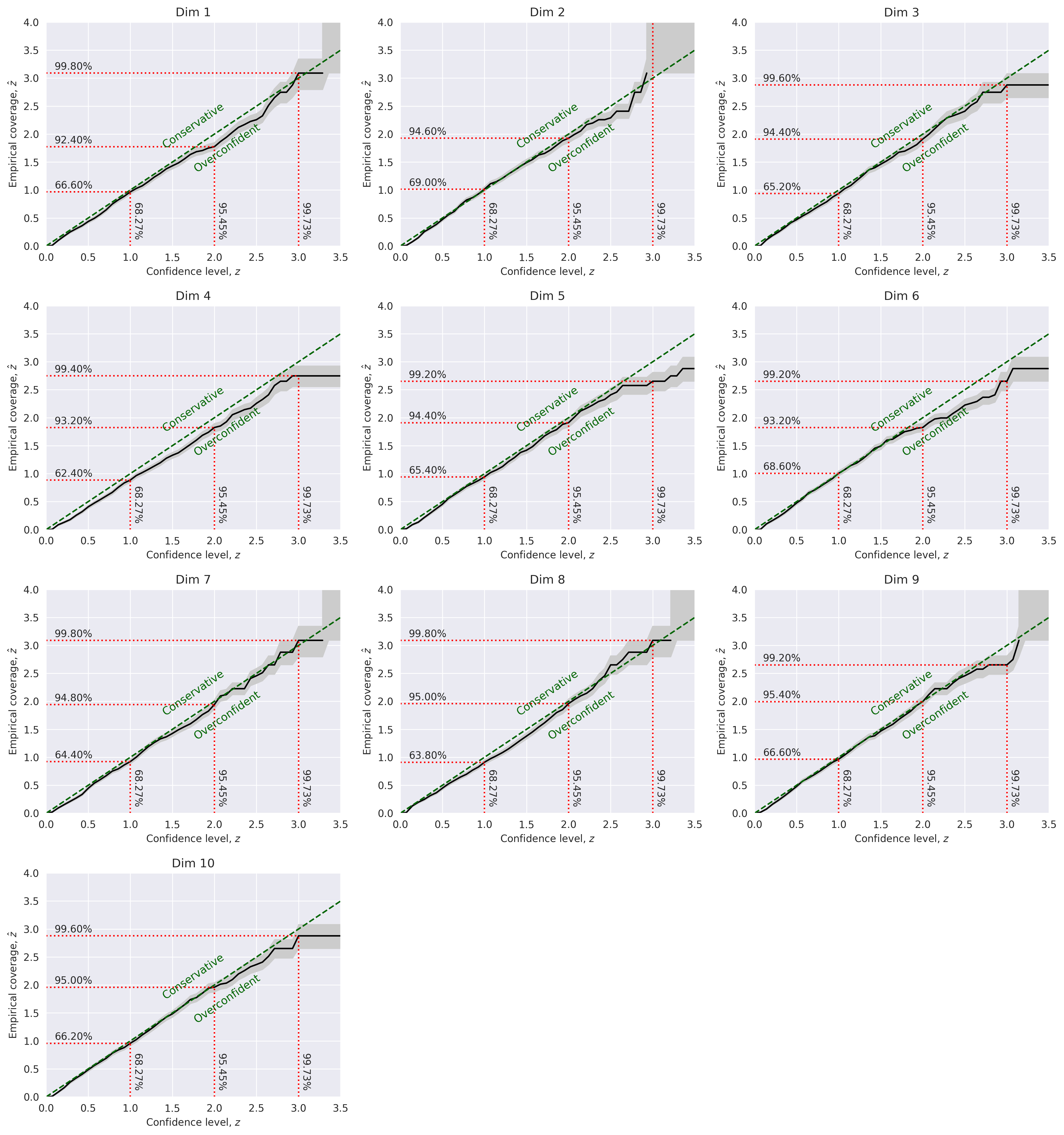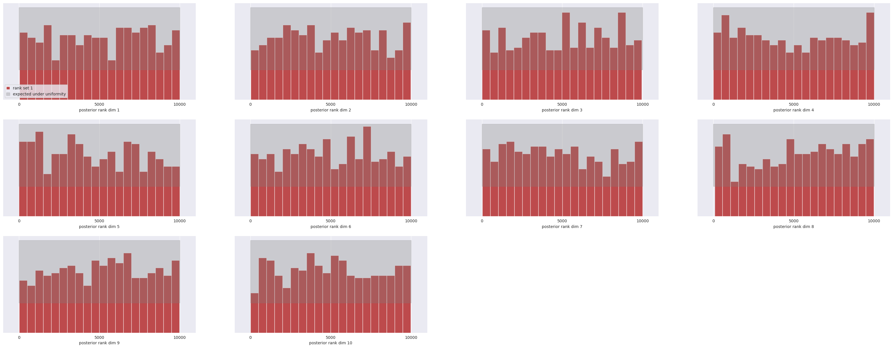 We report here the results of the posterior calibration tests. As an excercise, you can implement the tests as in the Two Moons example and compare the results.