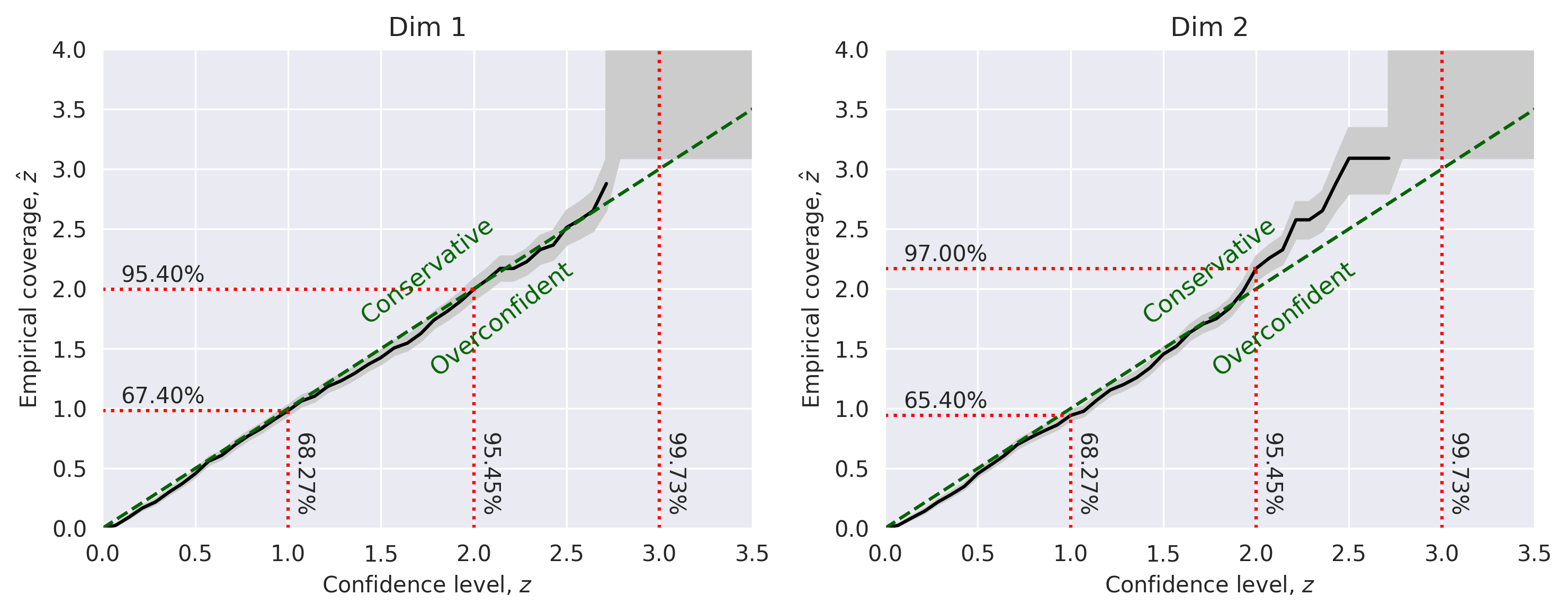 In this test, we compare the expected confidence level \(z\) with the empirical coverage level \(\hat{z}\) for each parameter.
