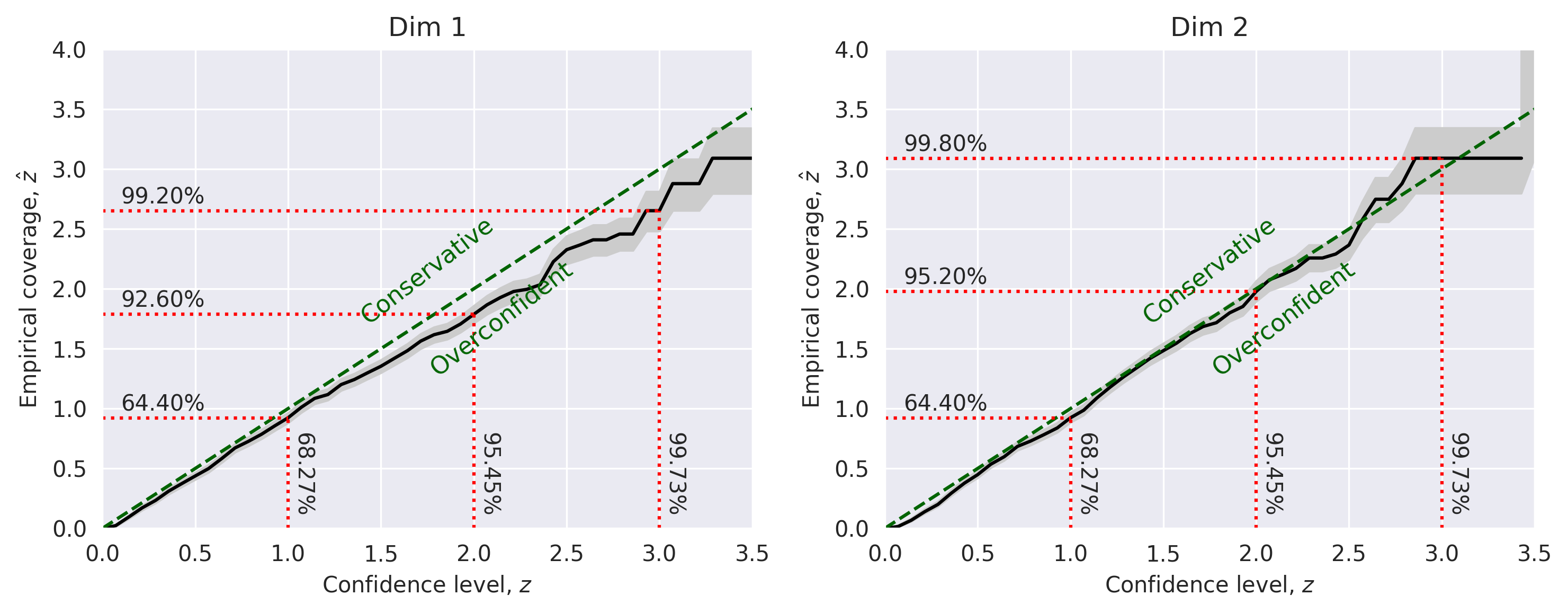 In this test, we compare the expected confidence level \(z\) with the empirical coverage level \(\hat{z}\) for each parameter.