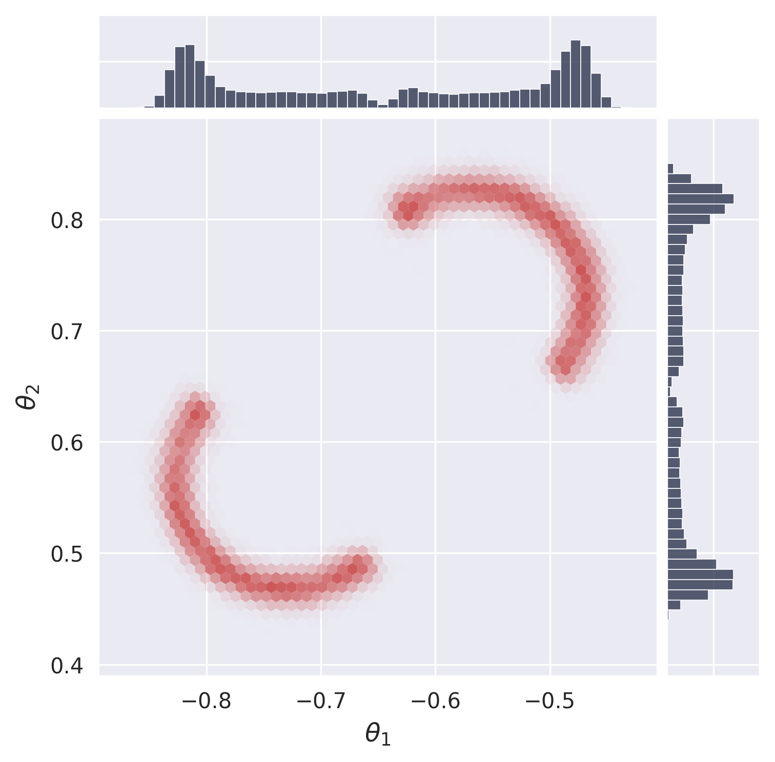 plot_marginals(np.asarray(reference_samples, dtype=np.float32), gridsize=50,range=[(-1,0),(0,1)], plot_levels=False, backend="seaborn")