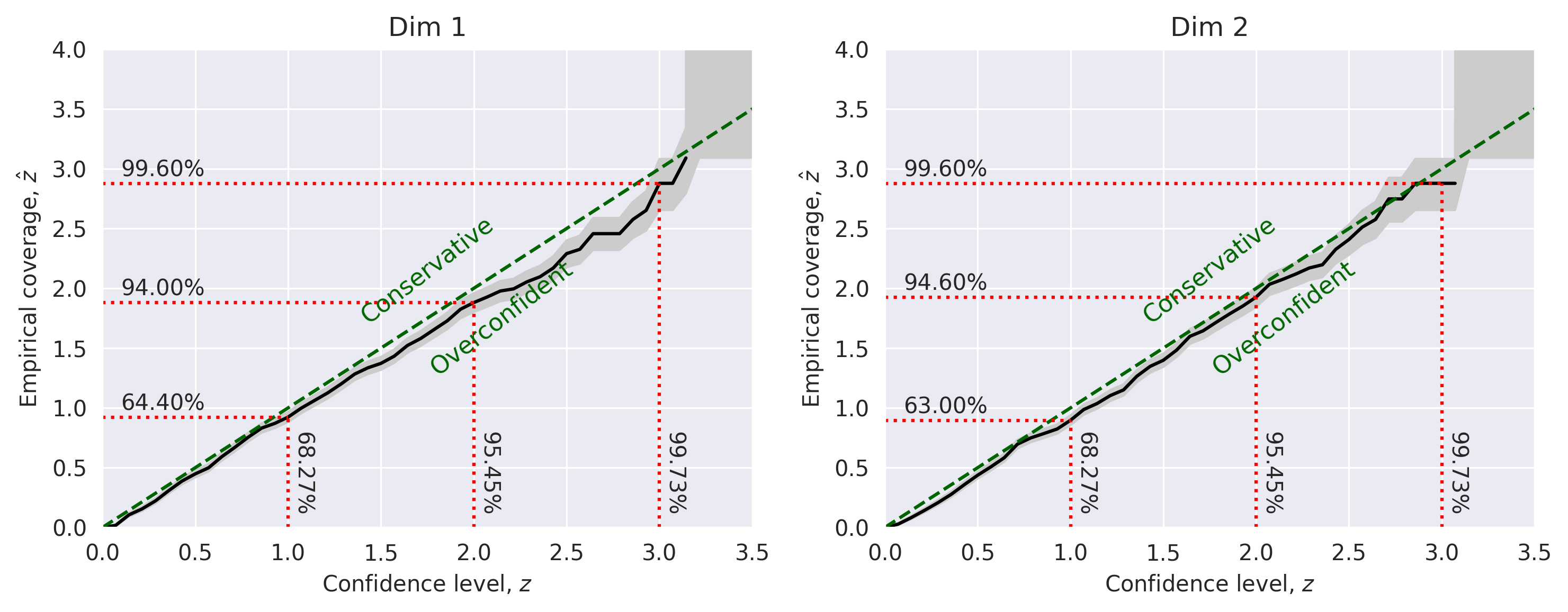 In this test, we compare the expected confidence level \(z\) with the empirical coverage level \(\hat{z}\) for each parameter.